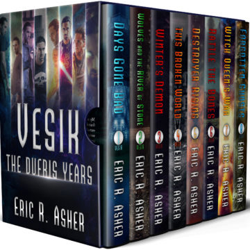 Today’s contest / giveaway is for winner’s choice of ebook from Eric’s catalog! (And yes, you could even choose a box set like the one pictured, books 1-8 of the Vesik series!)