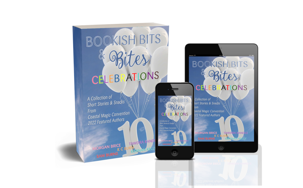 Since we’re doing Coastal Magic as a virtual event for a second year, our charity efforts will once again be focused on our BOOKISH BITS & BITES anthology. Since this is our 10th Anniversary weekend, our participating Featured Authors each contributed a “celebration” story and a recipe to go along with it.